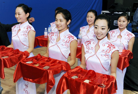 3.禮儀小姐隨頒獎?wù)呱砗笊吓_。